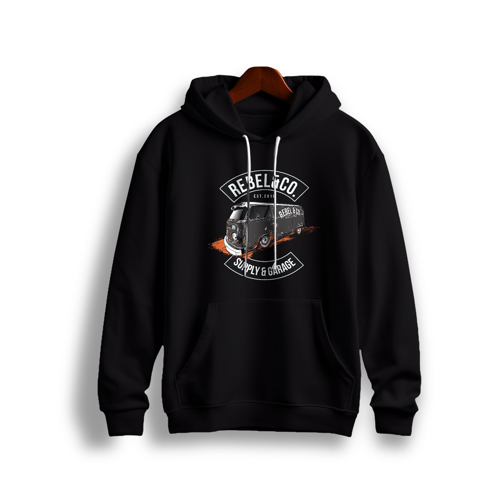 This cool black pullover hoodie features a circular graphic for Rebel & Co. Supply & Garage, established in 2019. The center of the design prominently showcases a vintage, lowered Volkswagen T1 or T2 bus, giving off a classic garage or customization shop vibe. The VW bus is depicted with stylized motion or a burnout effect below it. Crafted from a comfortable and warm fabric blend, this unisex hoodie is a great piece of apparel for fans of classic cars, custom shops, and automotive lifestyle brands. It features a traditional relaxed fit, a warm front kangaroo pocket, and an adjustable drawstring hood, perfect for casual wear and car meets.