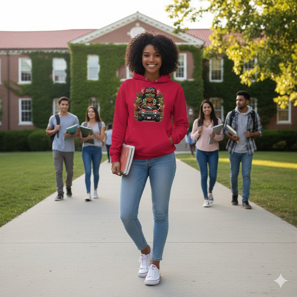 This hoodie features a high-quality, vibrant illustration of a confident street queen wearing a “DOPE” cap, stylish shades, and bold accessories, paired with an aggressive luxury SUV design. The artwork pops perfectly on a clean white hoodie, making it a must-have for streetwear lovers.