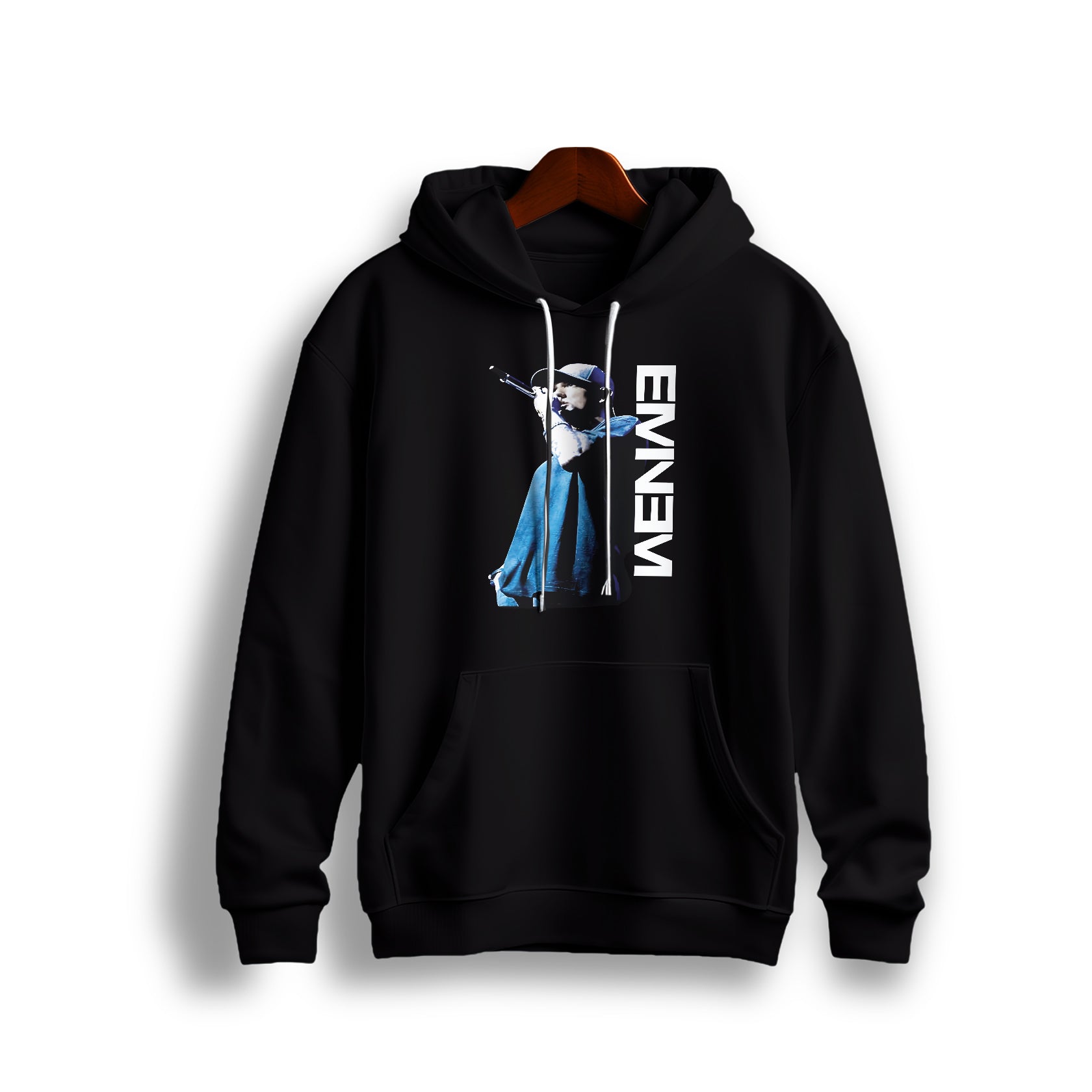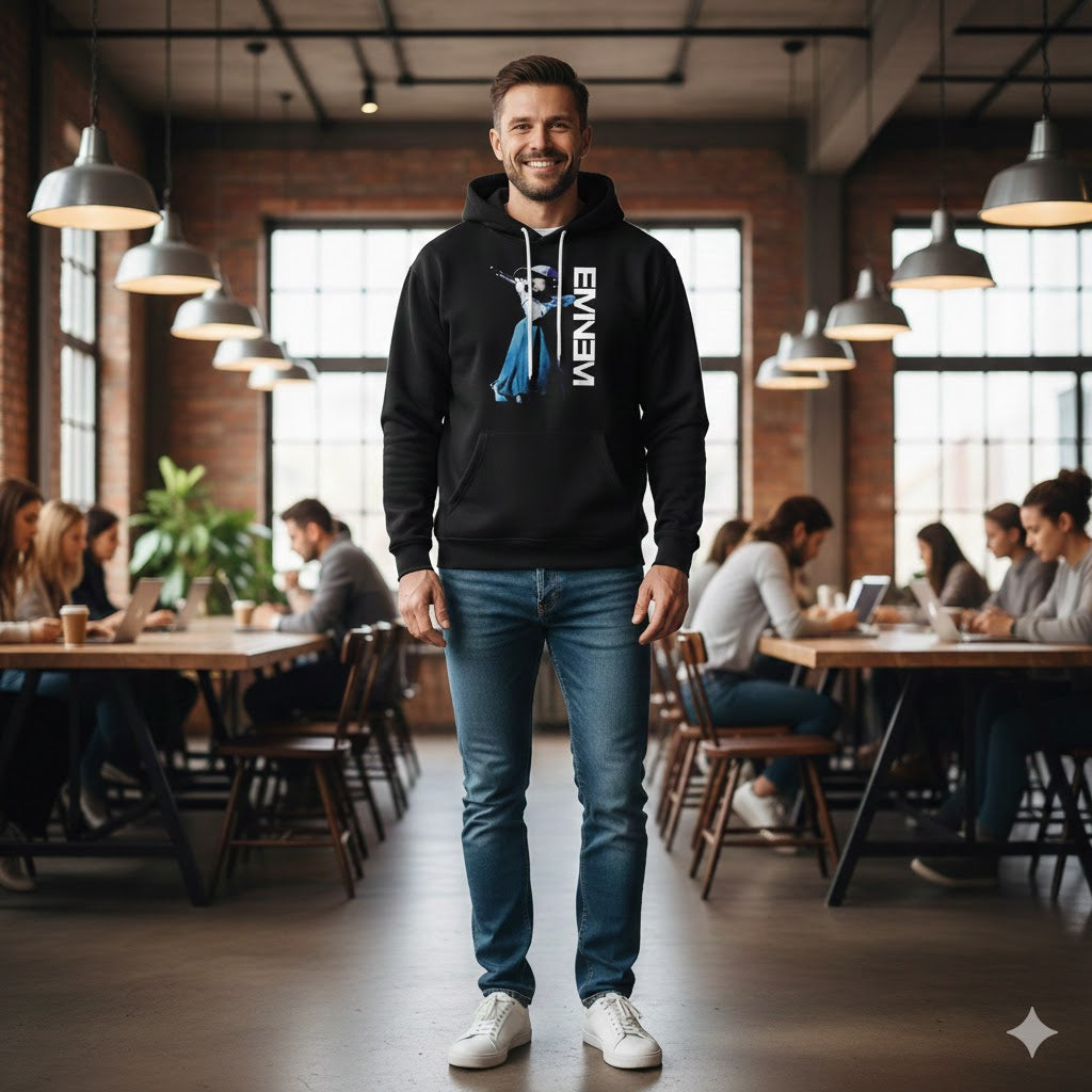 This impactful black pullover hoodie features a central graphic of the legendary rapper Eminem in an iconic stage pose, dressed in a blue jacket and hat, holding a microphone. The design is framed by the word EMINEM printed vertically in bold white text to the right of the image. Crafted from a comfortable and warm fabric blend, this unisex hoodie is essential merchandise for any fan of the rap god, Marshall Mathers. It includes a traditional relaxed fit, a warm front kangaroo pocket, and an adjustable drawstring hood, offering a stylish and bold way to showcase appreciation for the influential artist.