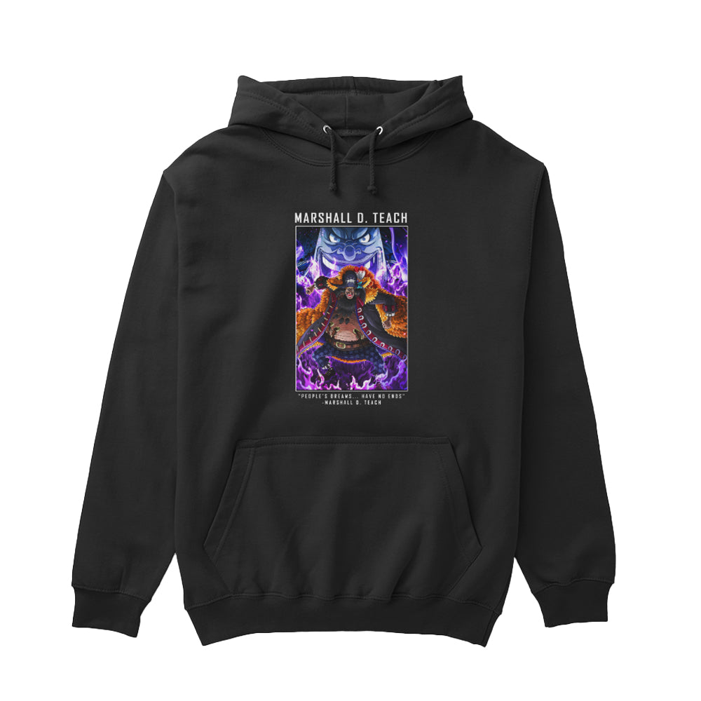"People's dreams... have no ends!" Embrace the power of the dark with this striking Marshall D. Teach Blackbeard Hoodie. Featuring the Emperor of the Sea surrounded by a sinister, crackling purple aura, this black hoodie is designed for fans who appreciate the lore, the villains, and the darker side of the Grand Line.