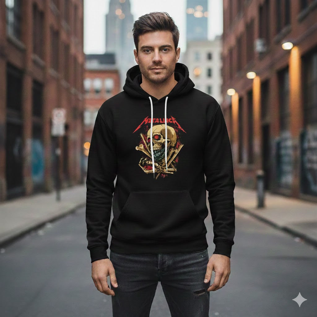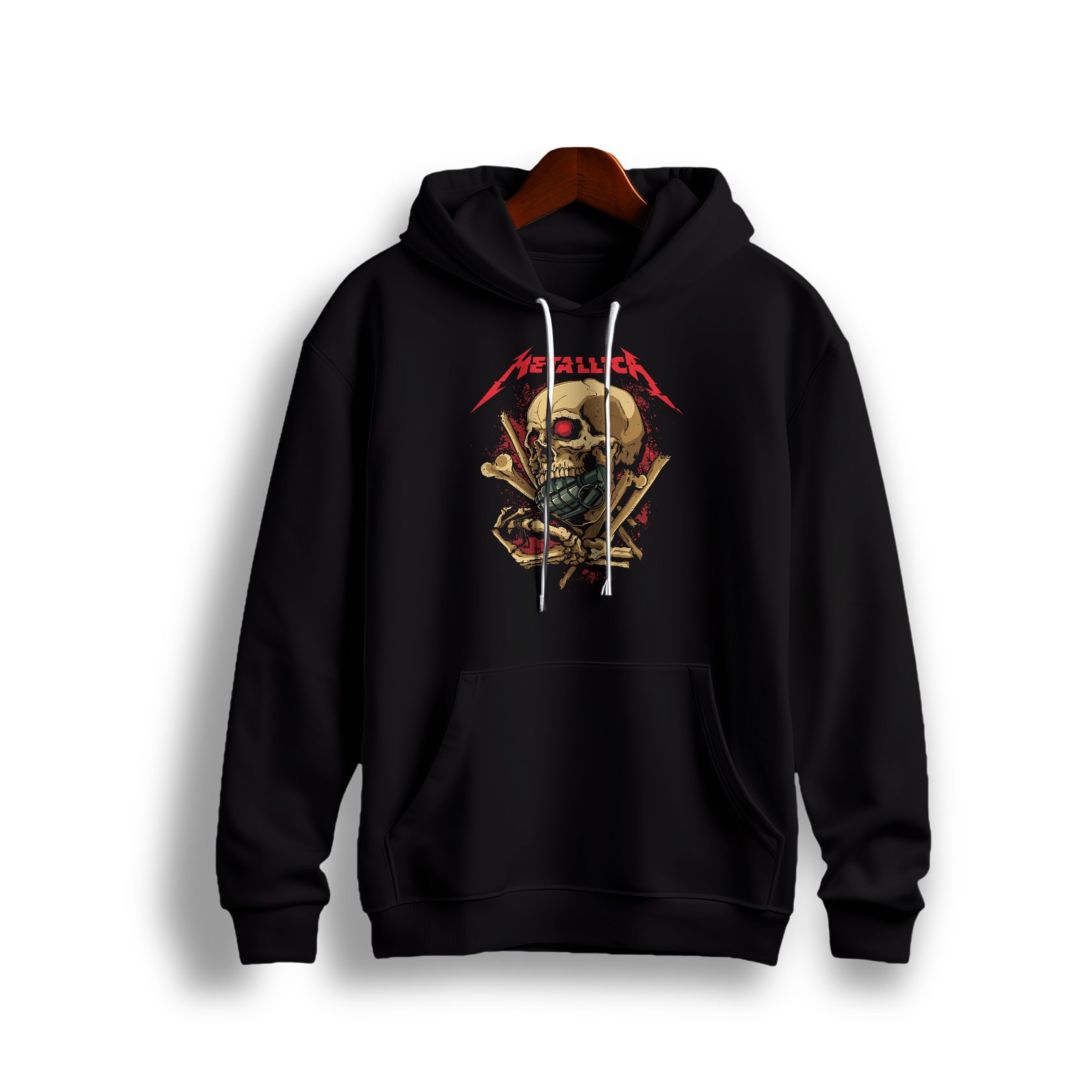 This aggressive black pullover hoodie features a striking graphic centered on a detailed skull and crossbones design, a classic motif often associated with heavy metal. The image includes the distinctive, jagged red Metallica logo placed just above the skull's head. Made from a comfortable and durable fabric blend, this unisex hoodie is a powerful piece of fan merchandise for any devotee of the iconic thrash metal band. It offers a relaxed fit, a practical front kangaroo pocket, and an adjustable drawstring hood, perfect for making a bold statement at concerts, casual gatherings, or during everyday wear.