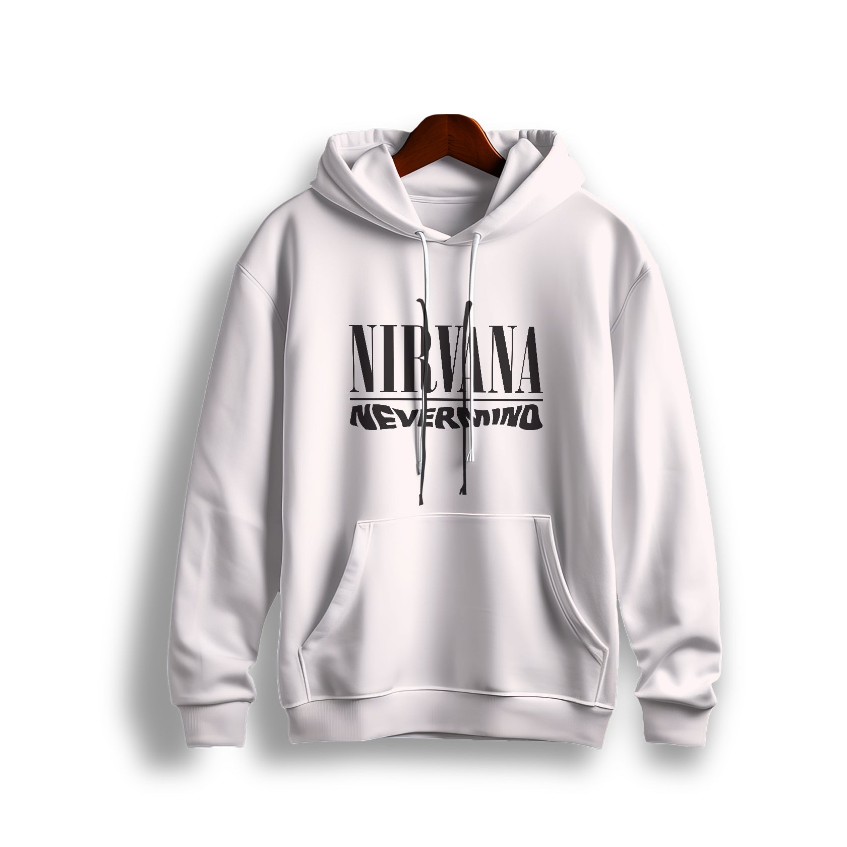 This comfortable white pullover hoodie features a classic grunge-era design inspired by the legendary band Nirvana and their iconic album, Nevermind. The graphic displays the band name NIRVANA in a prominent, bold typeface with the album title NEVERMIND styled underneath. Made from a soft, cozy fabric, this unisex hoodie is a perfect piece of music merchandise for fans of Kurt Cobain, Dave Grohl, and Krist Novoselic, representing one of the most influential albums in rock history. It includes a traditional relaxed fit, a useful front kangaroo pocket, and an adjustable drawstring hood, offering a simple yet impactful way to showcase appreciation for the 90s alternative rock scene.