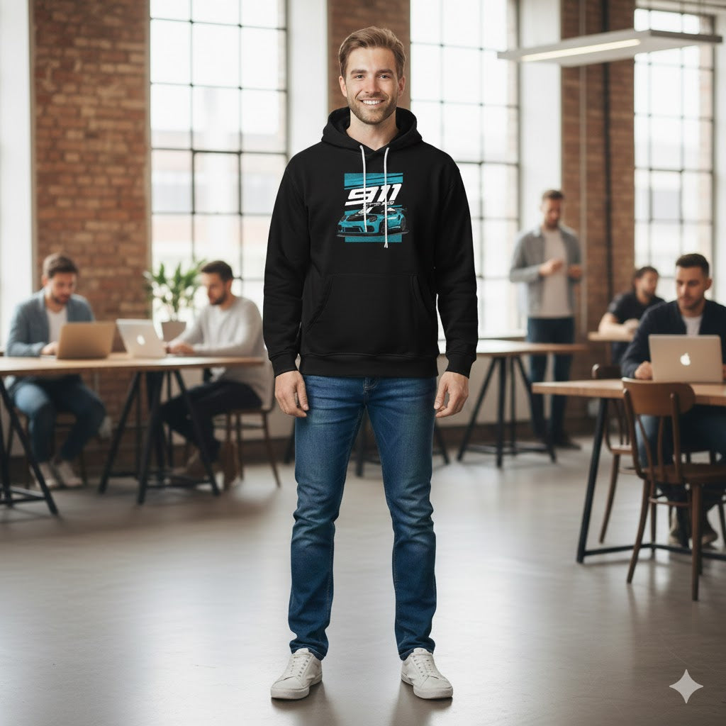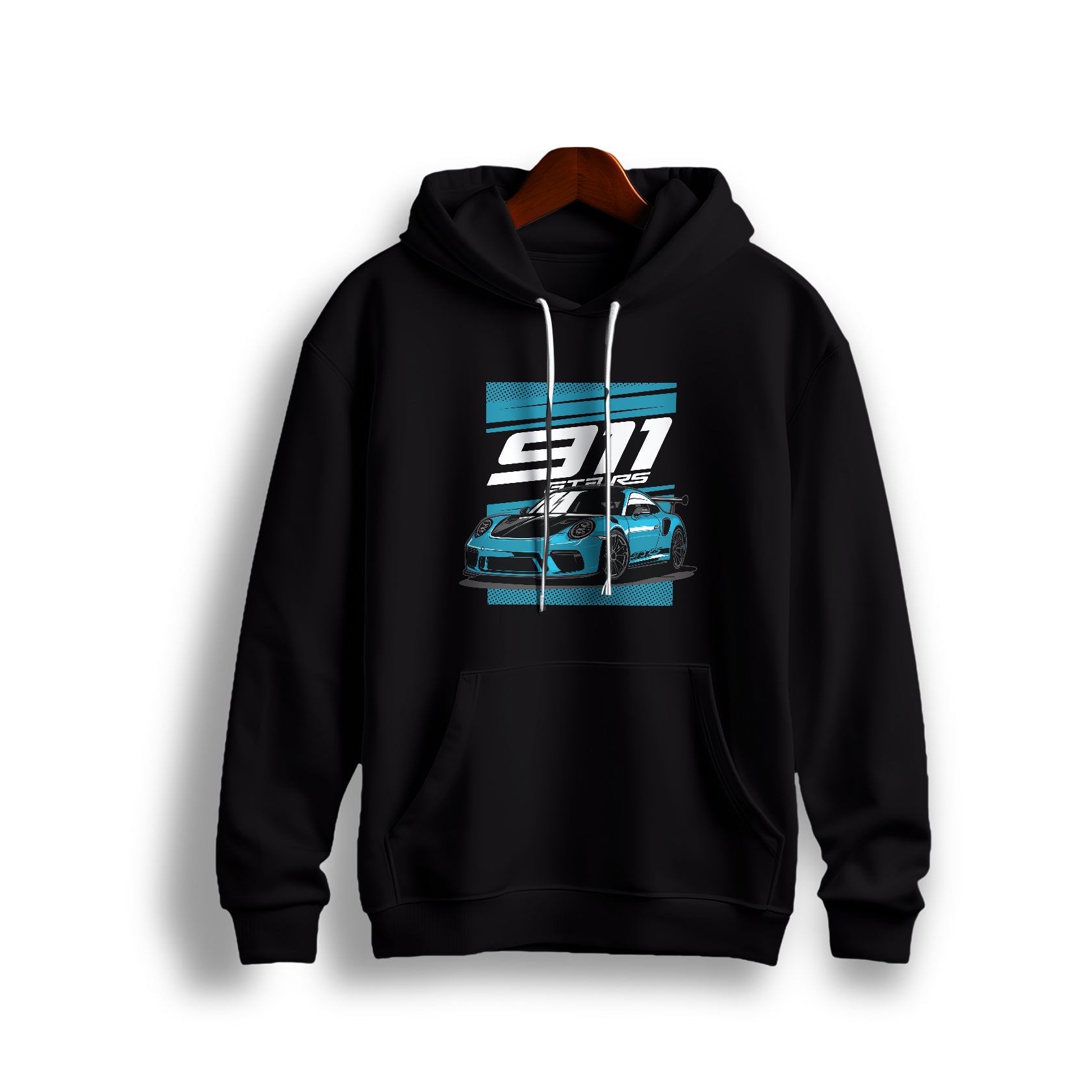 This cool black pullover hoodie features an eye-catching graphic celebrating the high-performance Porsche 911 GT3 RS. The design showcases a dynamic illustration of the modern GT3 RS in a striking blue color, set against vertical blue and white stripes for a racing aesthetic. The iconic text 911 is prominently displayed above the car, with GT3 RS visible underneath. Crafted from a comfortable and warm fabric blend, this unisex hoodie is essential apparel for any luxury sports car enthusiast and fan of German engineering. It features a traditional relaxed fit, a warm front kangaroo pocket, and an adjustable drawstring hood, making it a stylish way to showcase appreciation for a track-focused legend.