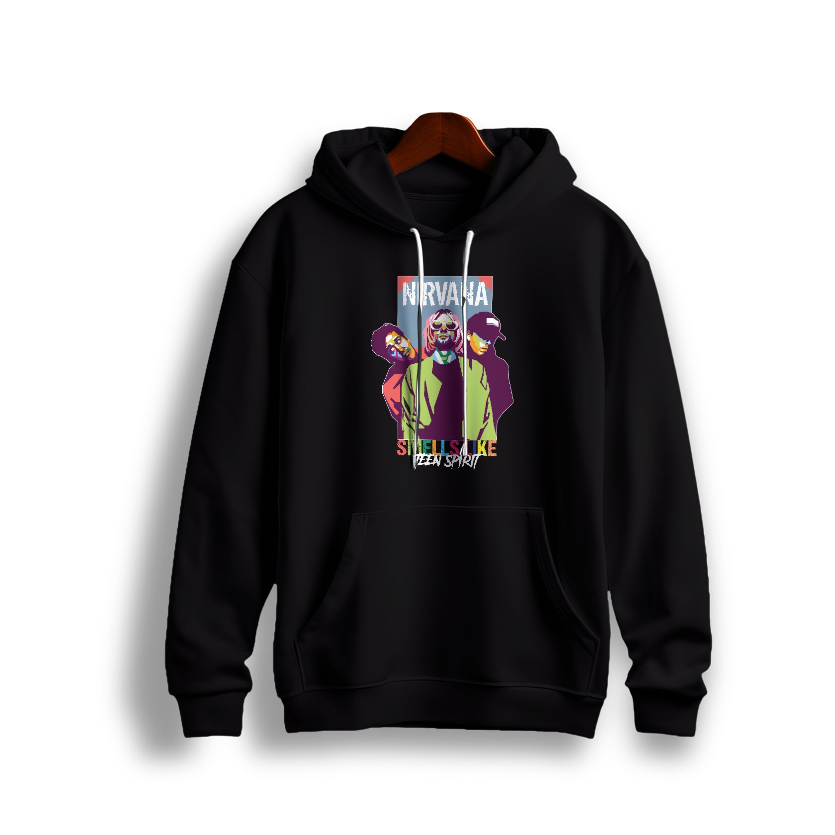 This striking black pullover hoodie features a vibrant, colorful graphic inspired by the legendary band Nirvana and their iconic anthem, Smells Like Teen Spirit. The design uses a bold, pop-art style illustration, possibly depicting Kurt Cobain, set against a geometric background. The band name NIRVANA is prominently displayed at the top, and the song lyric SMELLS LIKE TEEN SPIRIT appears at the bottom. Crafted from a comfortable and warm fabric blend, this unisex hoodie is a perfect piece of merchandise for any fan of the 90s grunge movement. It features a traditional relaxed fit, a cozy front kangaroo pocket, and an adjustable drawstring hood, offering a unique and eye-catching way to celebrate one of the most influential bands in rock history.
