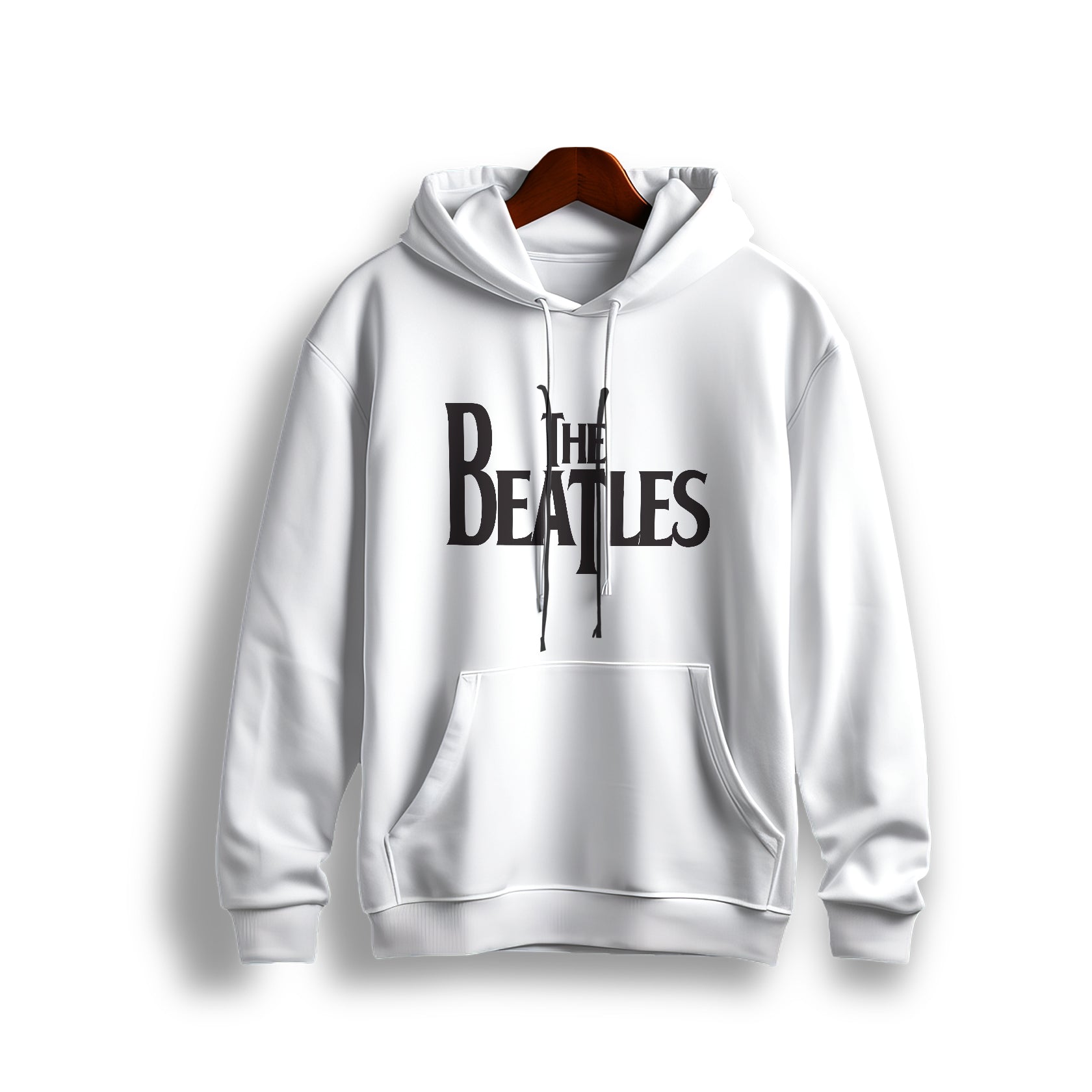 This clean white pullover hoodie features the universally recognized, classic logo of The Beatles prominently displayed in black across the chest. The design features the iconic dropped-T in the word BEATLES, a timeless symbol of the legendary band. Crafted from a soft and comfortable fabric blend, this simple yet impactful unisex hoodie is essential apparel for any fan of the Fab Four. It includes a traditional relaxed fit, a warm front kangaroo pocket, and an adjustable drawstring hood, offering a straightforward and stylish way to celebrate the music and legacy of one of the greatest bands in history.